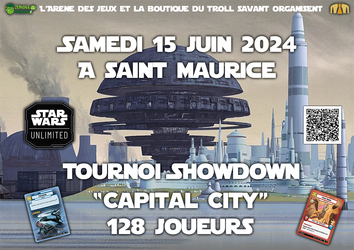 Vous êtes sur le point de vous inscrire sur le logiciel de gestion de tournoi de l'événement Showdown "Captial City" du 15 juin 2024 à Saint Maurice, un tournoi en construit pour le jeu Star Wars Unlimited.