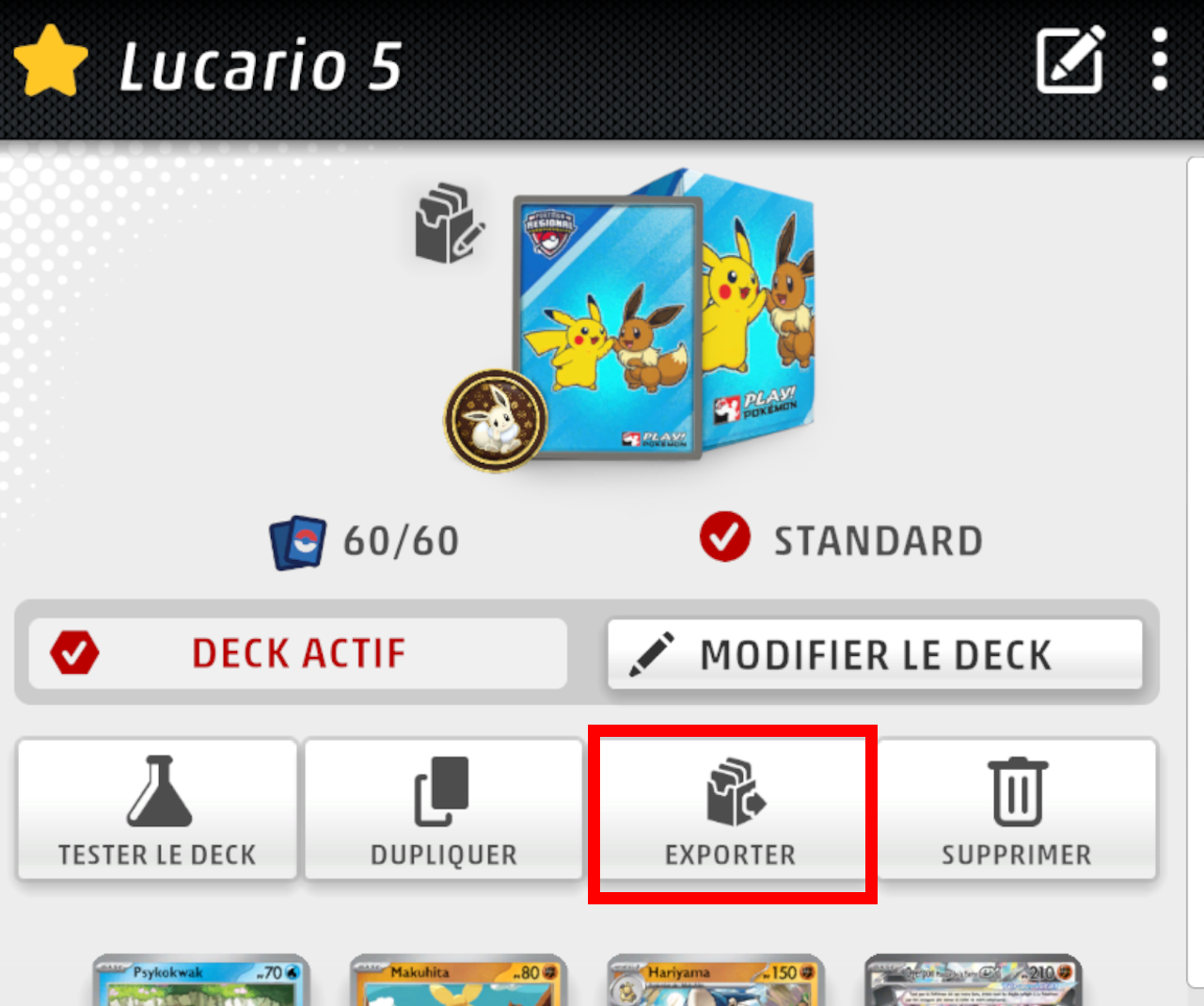 3.2 Maintenant rends toi sur TCG LIVE sur le deck que tu veux jouer en tournoi et clique sur "Exporter"