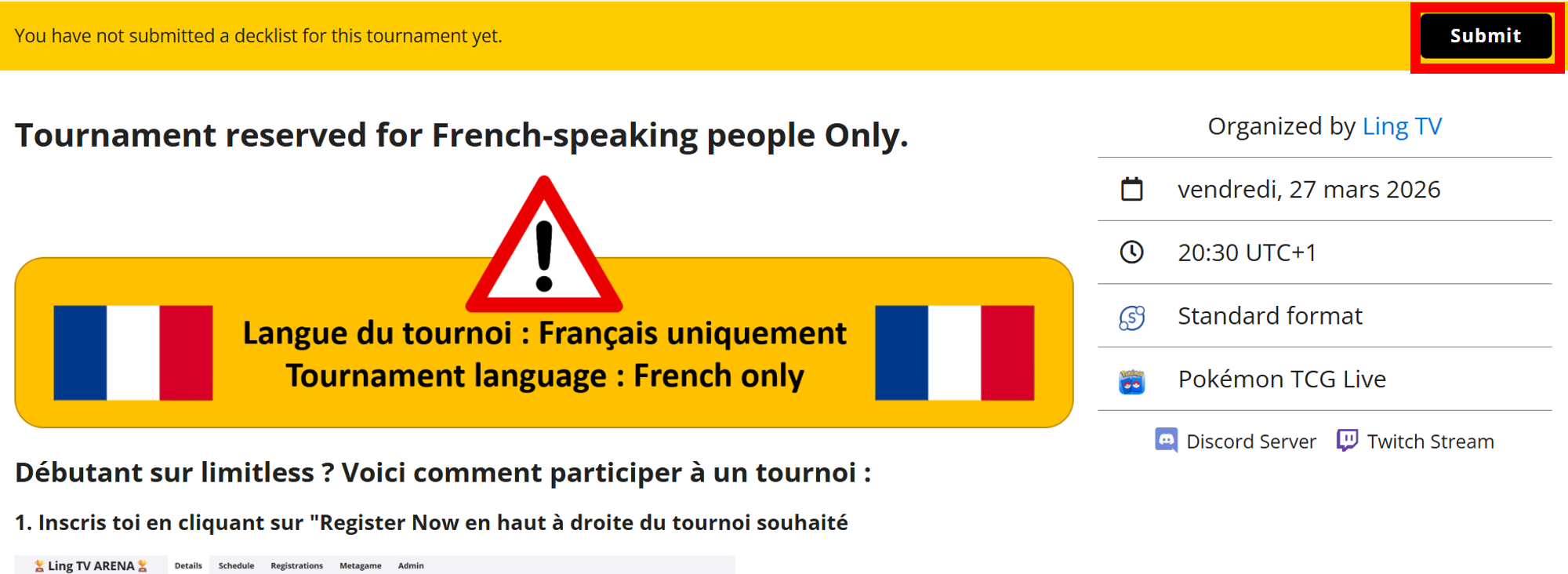 3.1 Une fois inscris sur le tournoi, une bannière orange va apparaître en haut, clique sur "Submit" en haut à droite
