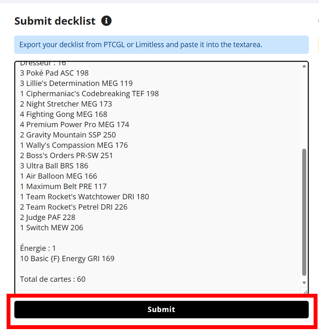 3.3 Retourne maintenant sur ta page Limitless et fait un CTRL + V pour coller ta deckliste exportée. Clique ensuite sur Submite.